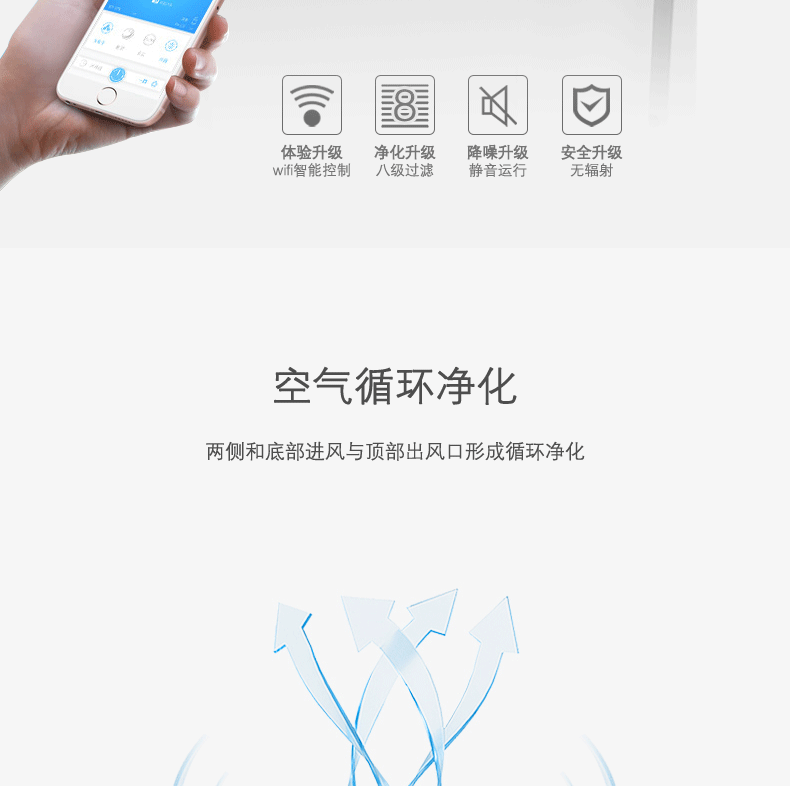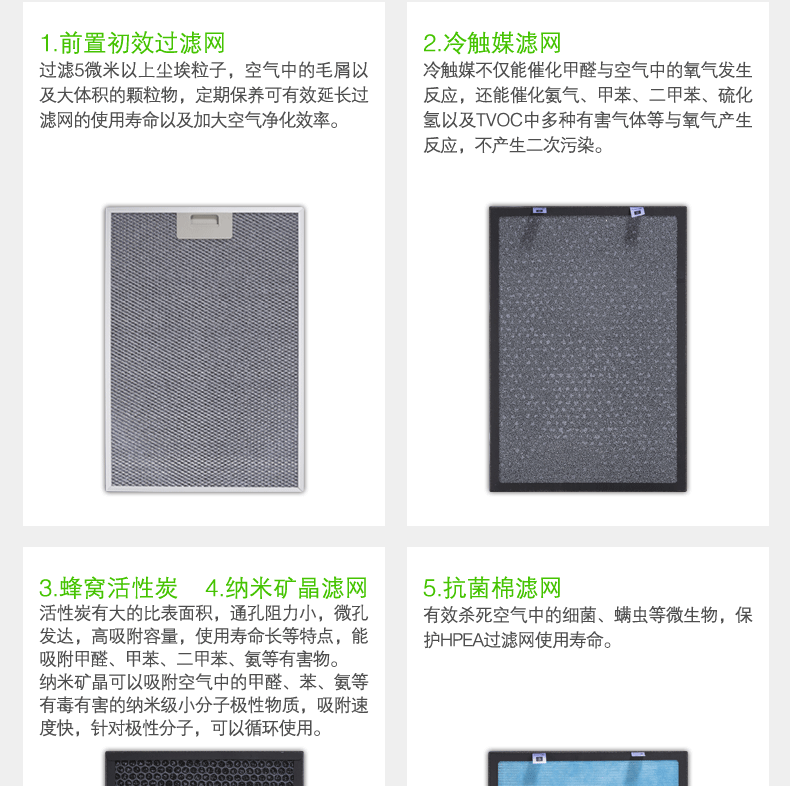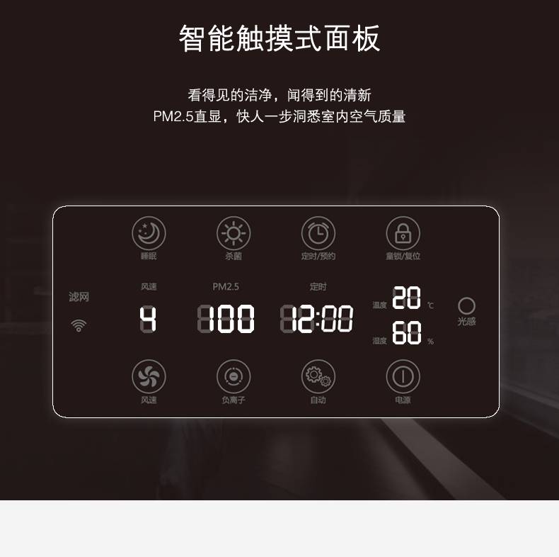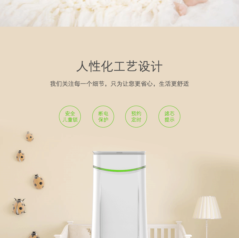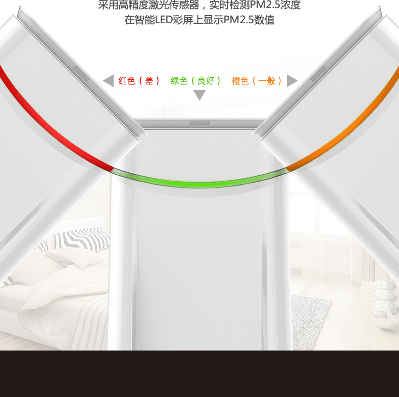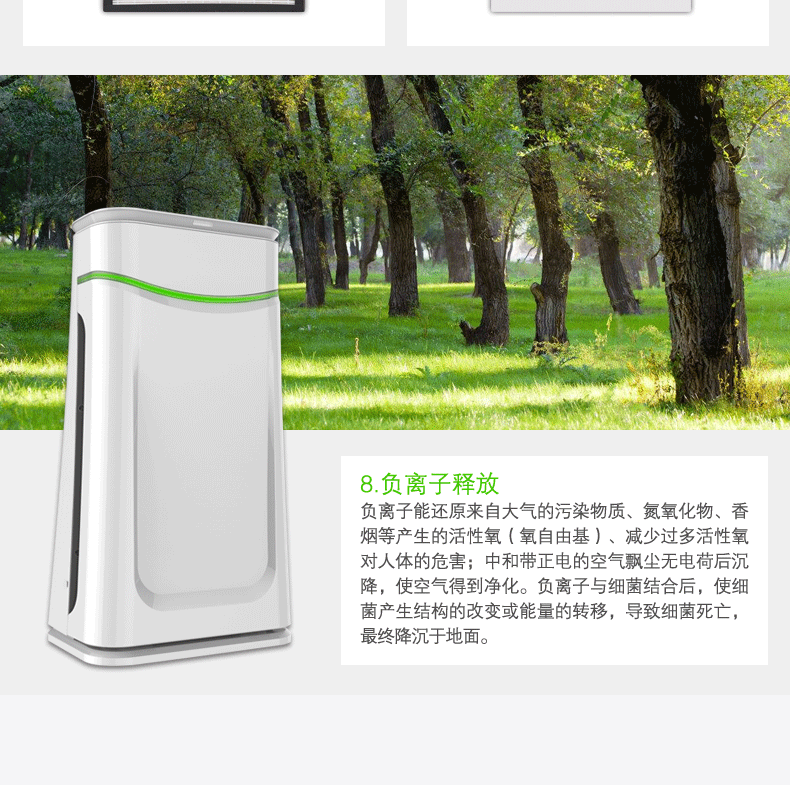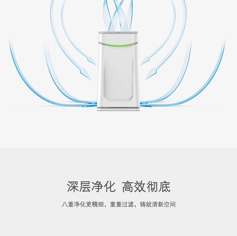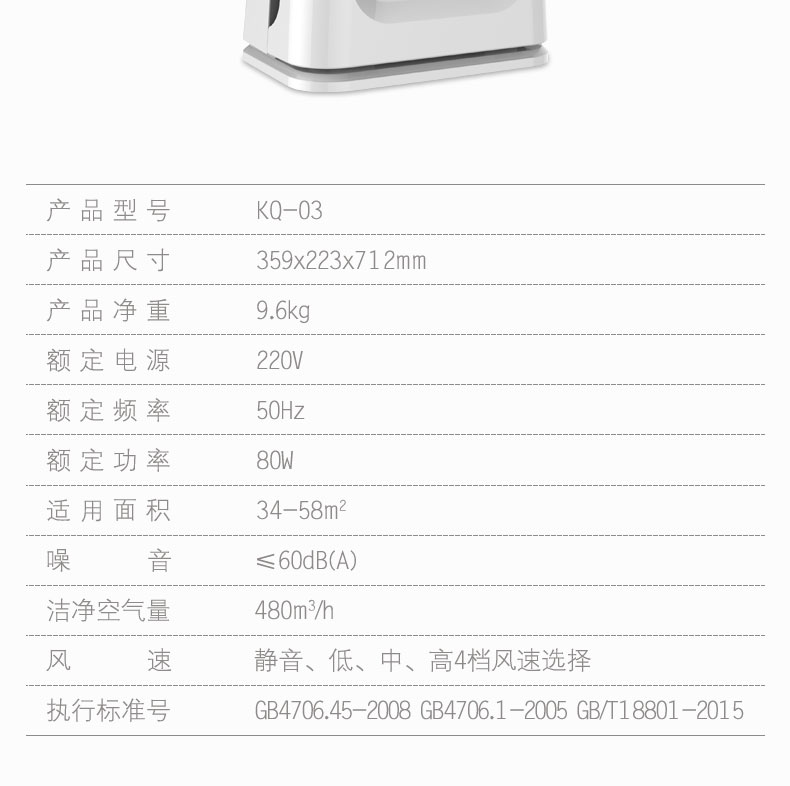 產品簡介:KQ03負離子空氣凈化器深層凈化,高效徹底,八中凈化更精細,重重過濾鑄就清新空間。負離子能還原來自大氣的污染物質、氮氧化物、香煙等產生的活性氧(氫自由基)減少過多活性氧對人體的危險;中和帶正電的空氣飄塵無電荷后沉降,使空氣得到凈化。負離子與細菌結合后,使細菌產生結構的改變或能量的轉移,導致細菌死忙,最終降沉于地面。