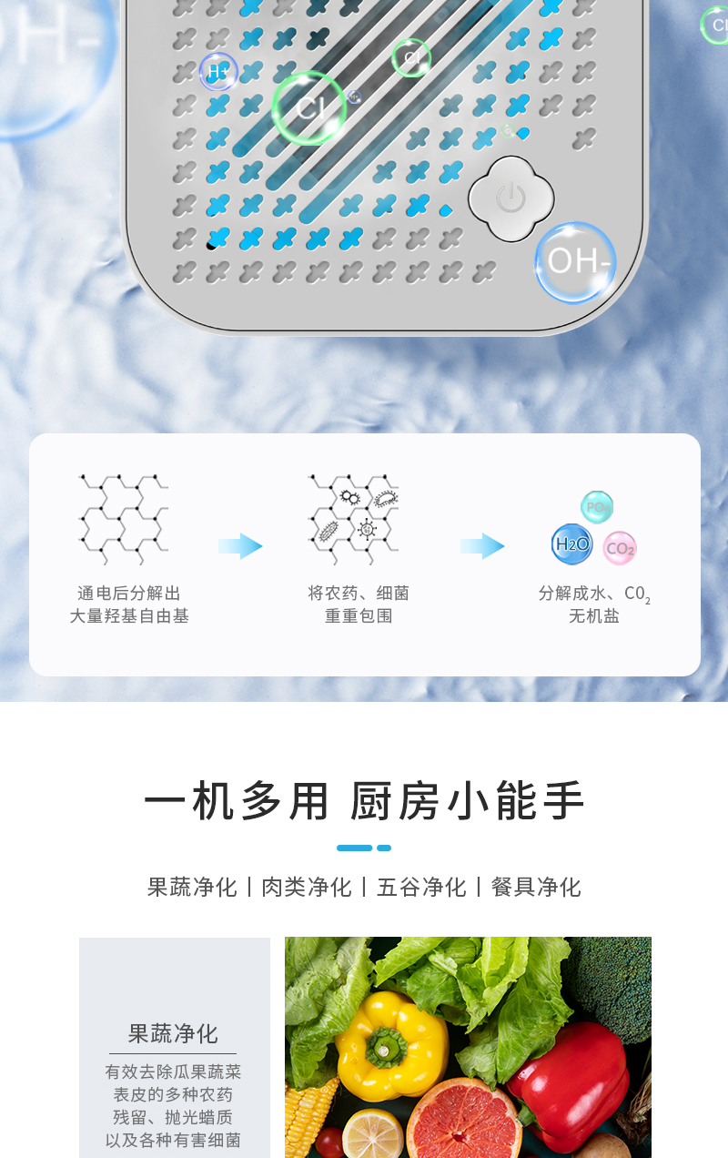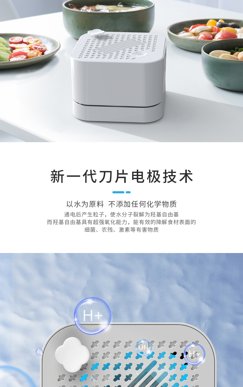 采用新一代刀片電極技術(shù)、以水為原料不添加任何化學(xué)物質(zhì),通電后產(chǎn)生粒子,使水分子裂解為羥基自由基具有強氧化能力,能有效的降解食材表面的細(xì)菌、農(nóng)殘、激素等有害物質(zhì)。水在離子發(fā)生器的作用下分解成OH-和H+;分解的一部分OH-將農(nóng)藥和細(xì)菌細(xì)胞壁上的H+奪走并重組,形成無害物質(zhì);另一部分OH-和水中氯結(jié)合生成次氯酸,通過氧化反應(yīng)降解殺滅細(xì)菌。