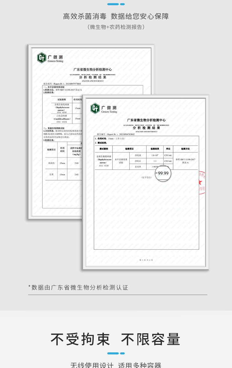 三、廣微測權(quán)威檢測認(rèn)證,除菌率高達(dá)99.9%;
