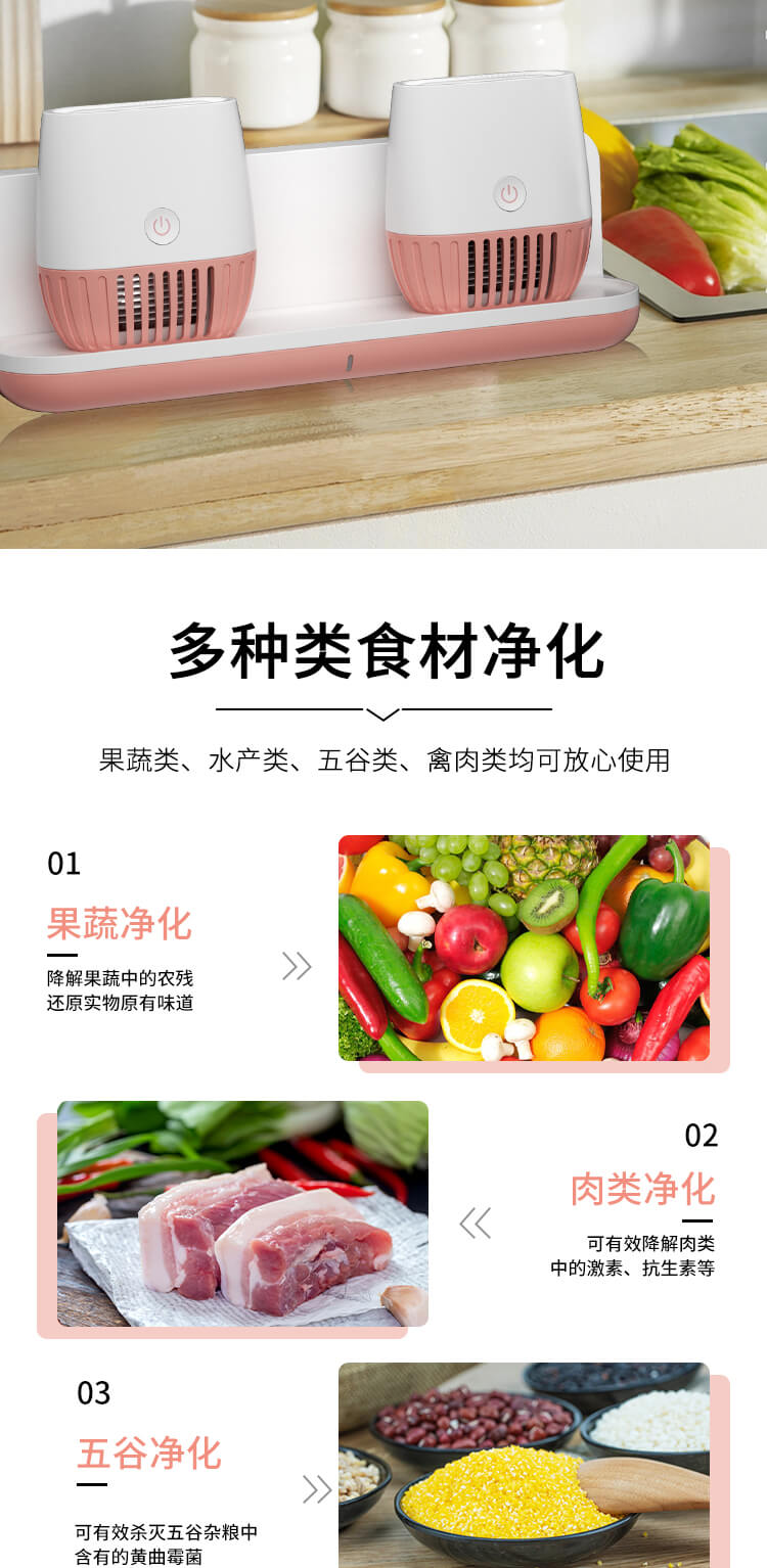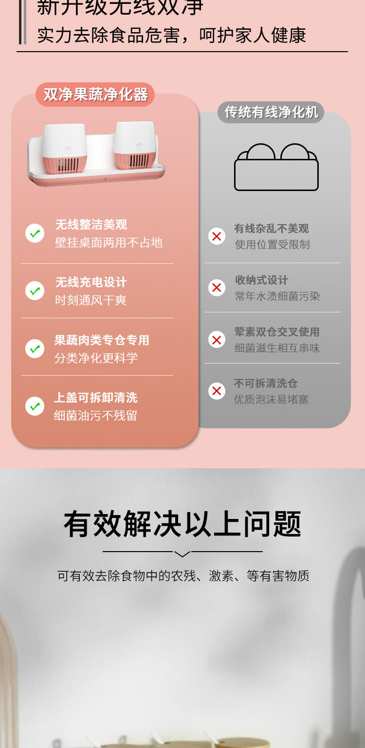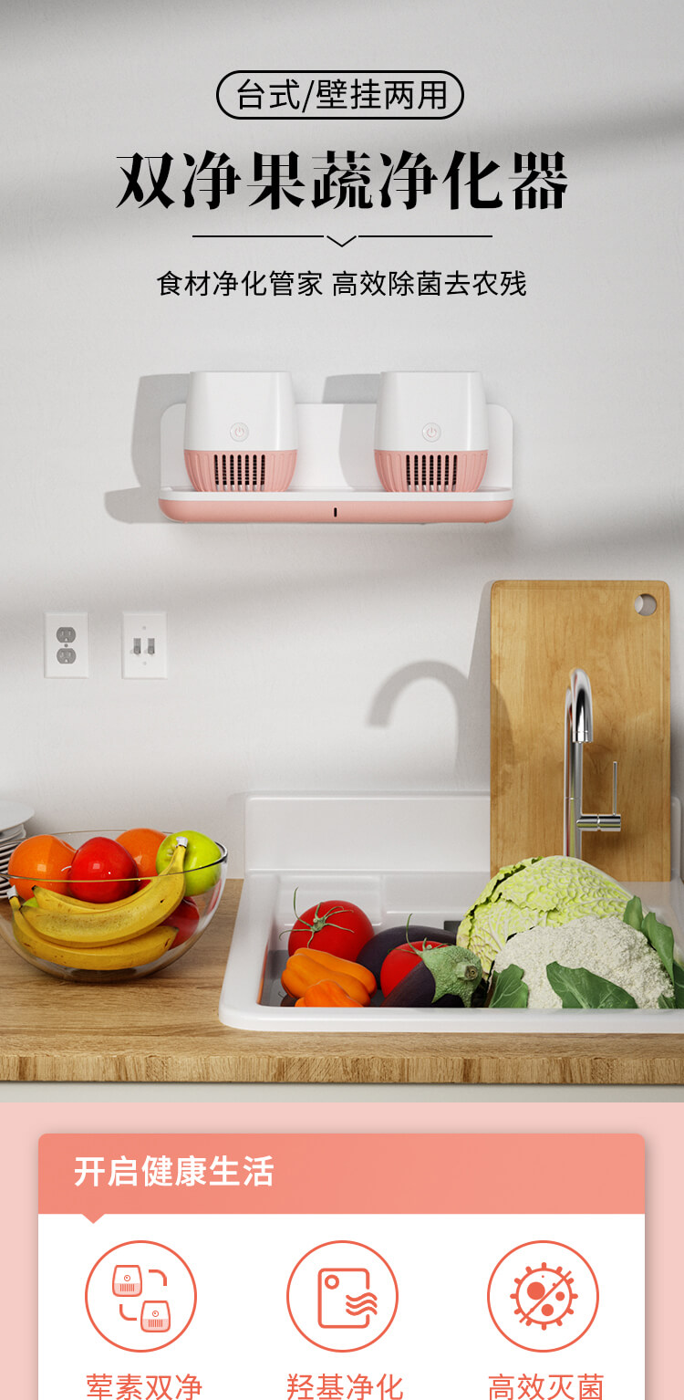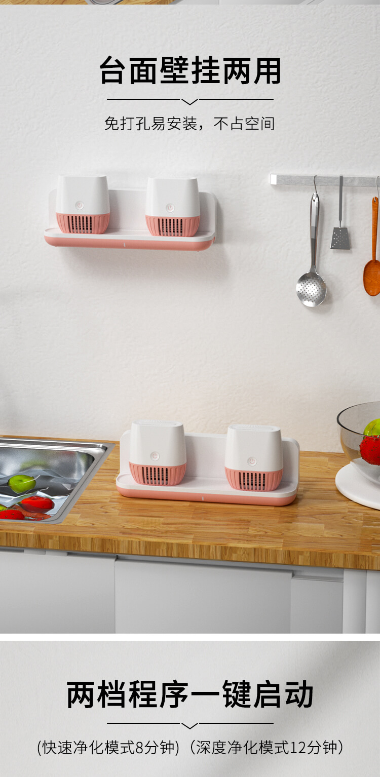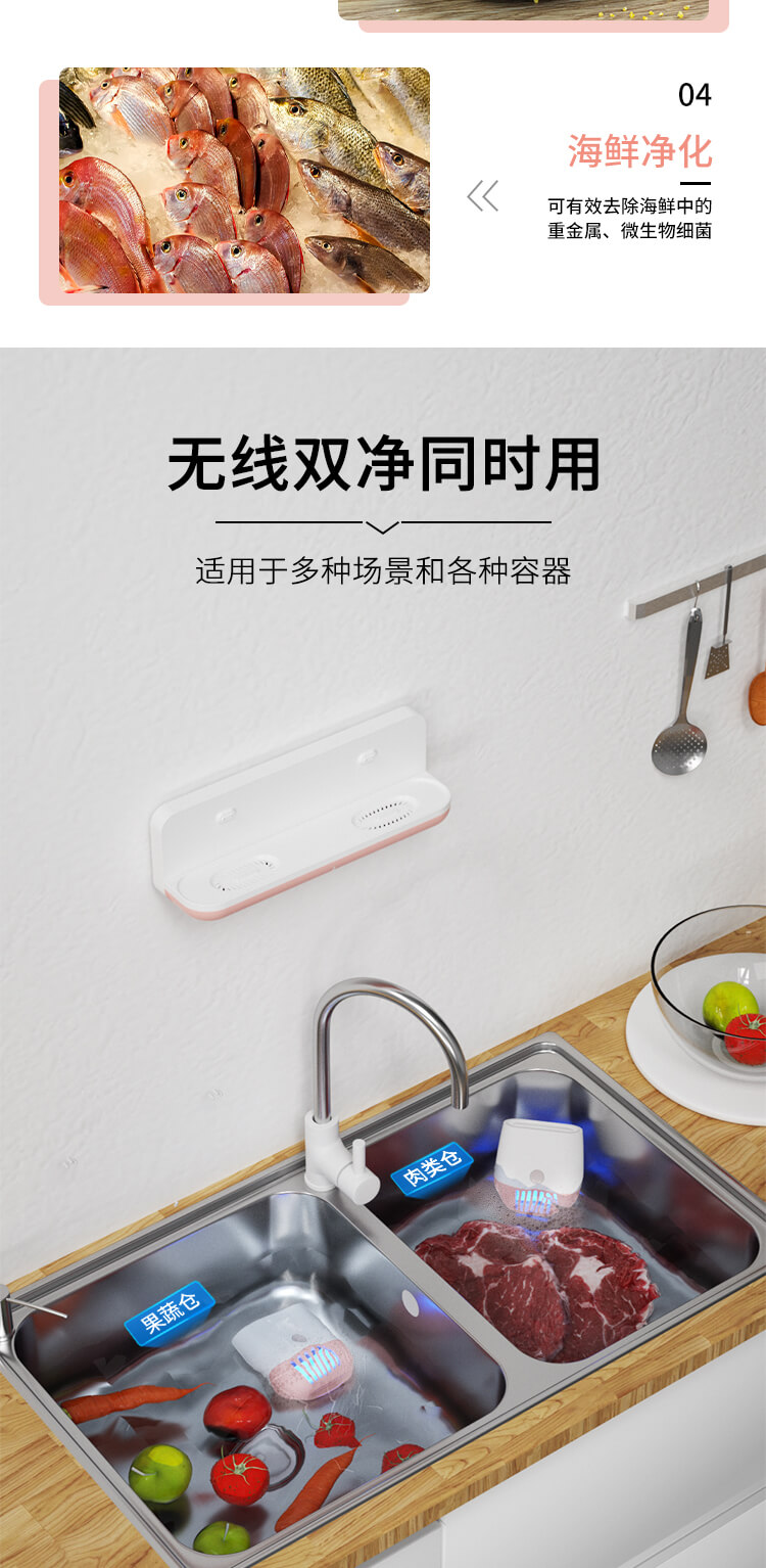 臺面壁掛雙用途,免打孔背膠設計,輕松掛在廚房任意角落,臺面放置小巧不占地方。無線雙倉設計,葷素雙凈同時啟動,專用果蔬、肉類點解發(fā)生器,避免交叉感染,雙凈同時啟動,省時更高效。