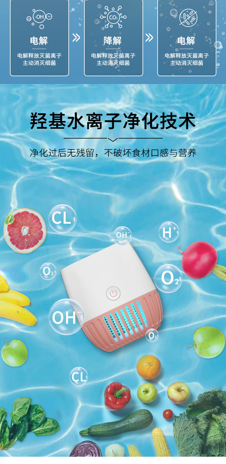 STY22果蔬清洗凈化機采用加強刀片電極凈化技術(shù)、航天級鈦合材質(zhì),以水為原料不添加任何化學物質(zhì),通電后產(chǎn)生粒子,使水分子裂解為羥基自由基具有強氧化能力,能有效的降解食材表面的細菌、農(nóng)殘、激素等有害物質(zhì)。水在離子發(fā)生器的作用下分解成OH-和H+;分解的一部分OH-將農(nóng)藥和細菌細胞壁上的H+奪走并重組,形成無害物質(zhì);另一部分OH-和水中氯結(jié)合生成次氯酸,通過氧化反應降解殺滅細菌。