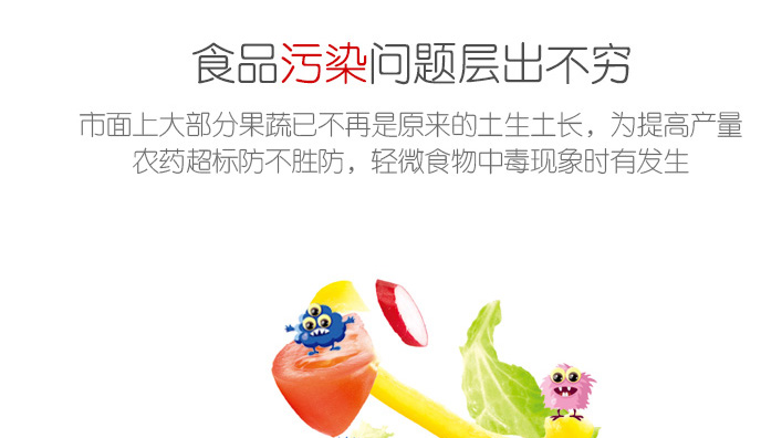 1、有效降解瓜果蔬菜中的農(nóng)藥殘留、激素殘留,消除表面的防腐劑和各種細(xì)菌、病毒,使你真正使用無公害綠色蔬果。